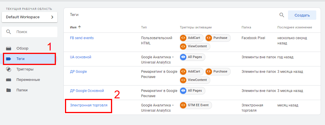 Перейдите в раздел “Тэги” и откройте тэг Электронной торговли: