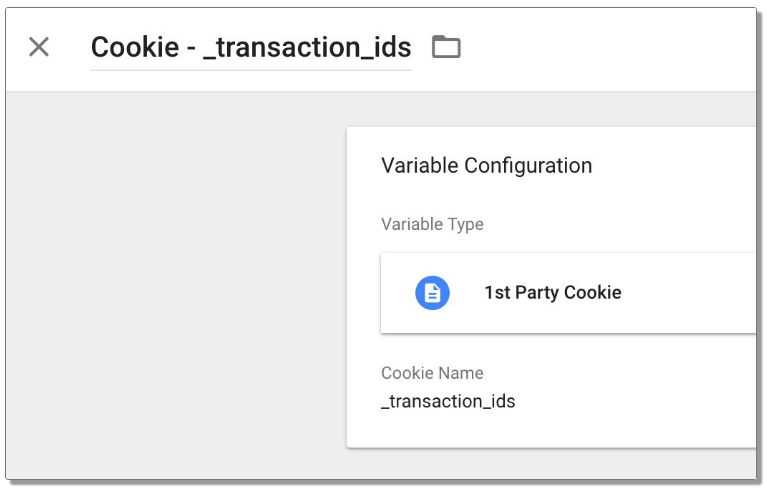 Создайте переменную 1st Party Cookie для списка ID транзакций, используя keyName, которое вы указали в customTask. Вот как будет выглядеть настройка по умолчанию: