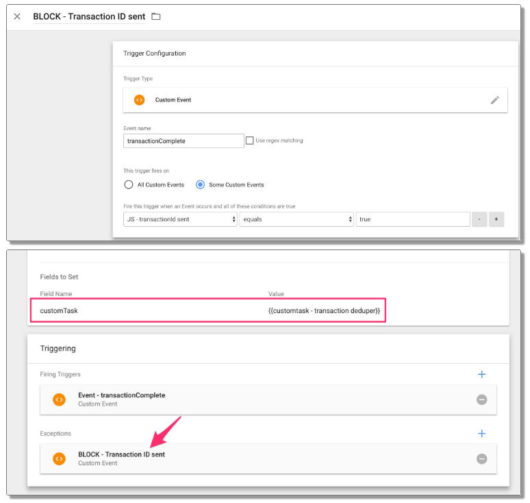 Т. к. в стандартной электронной торговле передача информации о покупке делится на хит транзакции и хит информации о товаре, логику блокировки было бы крайне сложно автоматизировать в customTask. Вот почему вам необходимо создать триггер исключения для вашего тега транзакции: он будет блокировать запуск тега, если ID транзакции найден в списке сохраненных идентификаторов.