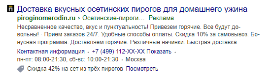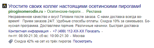 Прописали в заголовках потребность пользователя в зависимости от задачи, которая стоит перед ним: вкусно проставиться в офисе или поужинать дома, не напрягаясь. В настройках кампании использовали корректировки по полу, возрасту, гео и времени показа объявлений.