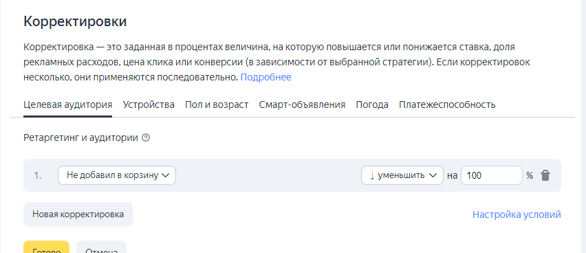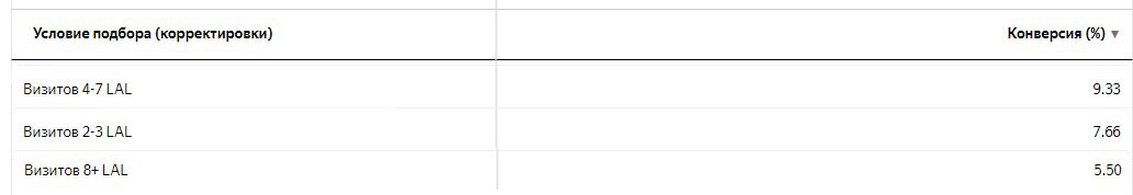 После того, как были сформированы все сегменты, мы создали условия для подбора LAL-аудитории в Яндекс.Директе и применили корректировку в 1% ко всем активным кампаниями для наблюдения.