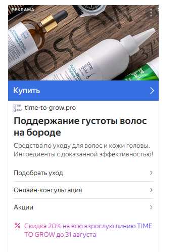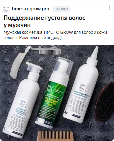 Здесь нас ожидали трудности с модерациями. В объявлении нельзя делать акцент на лечении, нужно было писать именно про помощь или поддержание здоровья, а например, заголовок «Шампунь при андрогенной алопеции», включающий в себя полное вхождение ключевого слова, не пропускали.