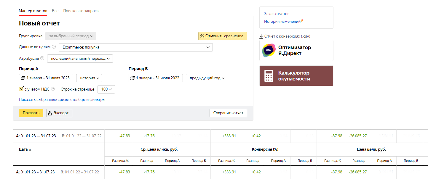 Также мы пересобрали классические поисковые кампании, подключили автотаргетинг на поиске. По сравнению с аналогичным периодом мы снизили СРС и CPO, улучшили конверсию: