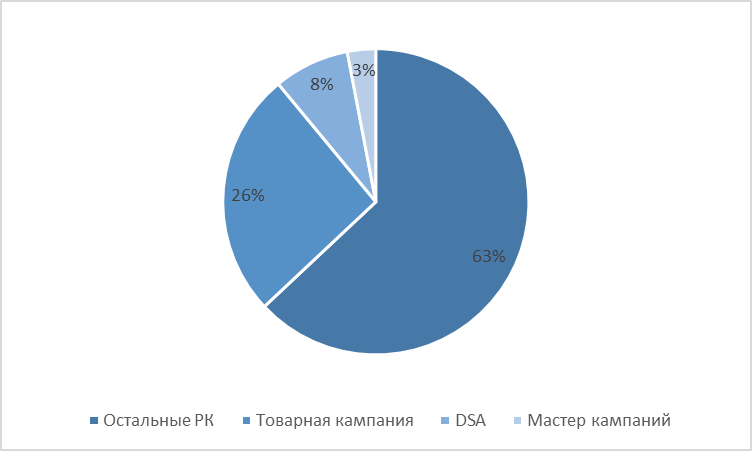 На помощь пришли динамические объявления (без товарной галереи) и гибридные кампании: Мастер кампаний и Товарная кампаний . В этих типах РК мы заминусовали брендовые запросы, не ограничивали никакими таргетингами. Мастер и Товарную запустили с оплатой за покупку, динамические объявления — с оплатой за клики. Все эти типы кампаний показали хорошие результаты и принесли 37% от общего дохода: