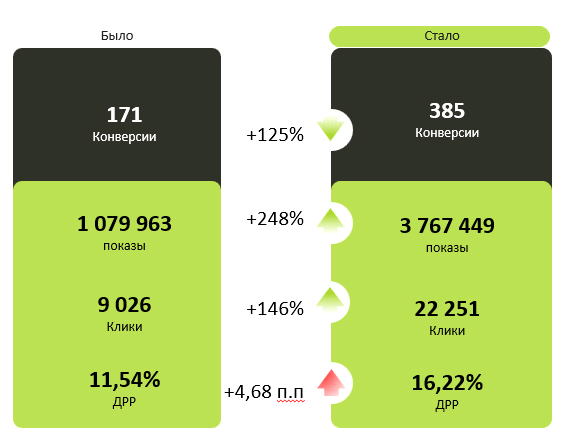 - Кампании, в которых изменили только модель оплаты на клики (смарт баннеры и динамическая кампания), показала отличные результаты по количеству конверсий. При увеличении ДРР до значения 16,2 % количество конверсий увеличилось на 125%.