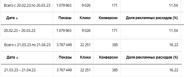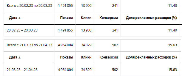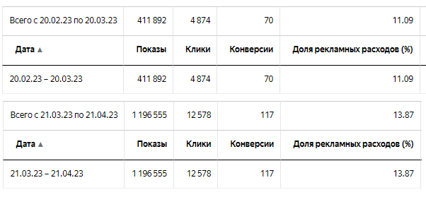 Сравнивали 2 периода: с 20.02.2023 по 20.03.2023 и с 21.03.2023 по 21.04.2023