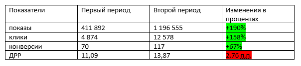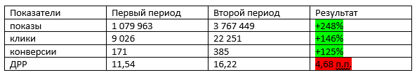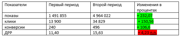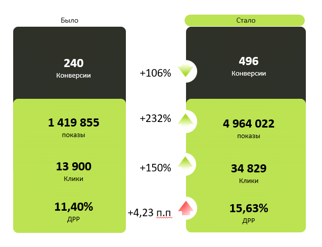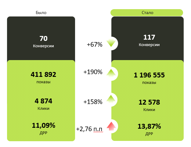 Общие результаты эксперимента показали, что модель оплаты за клики отлично подходит для кампаний, в которых проводился эксперимент. При росте ДРР на 4,23 п.п. общее количество конверсий увеличилось кратно.