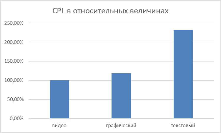 Если сравнивать цену конверсий, то видеоформат имеет колоссальное преимущество перед текстовым форматом и незначительное преимущество перед графическим форматом. В графике брали за 100% цену самого нижнего значения, а именно видеоформата.
