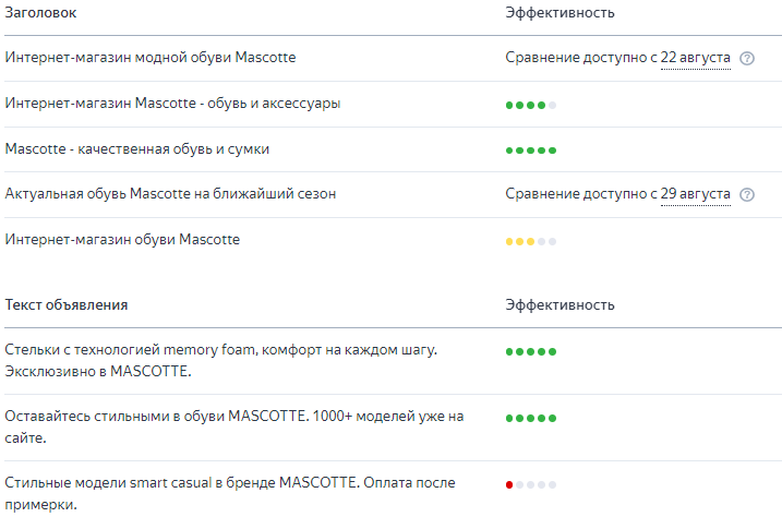 - оценка Яндекса для элементов объявления через индикаторы эффективности: