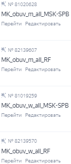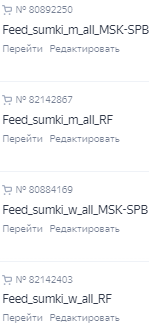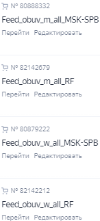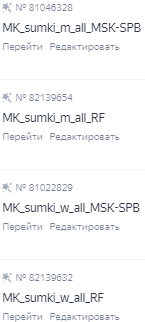 Итого после разделения товаров по гендерному признаку, типу товаров и географии показов получилось 8 Товарных кампаний и 8 Мастер-кампаний: