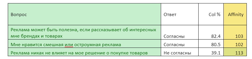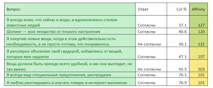 - Affinity — соотношение между покупателями бренда клиента, которые дали ответ со второго столбца, и всеми покупателями бренда клиента.