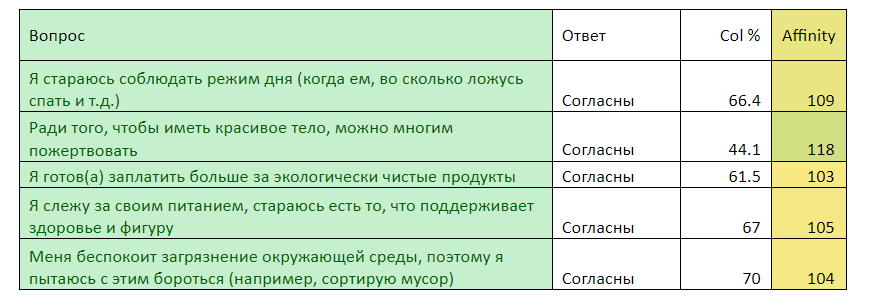 Что касается соблюдения режима дня, беспокойства об окружающей среде и приверженности к экологически чистой продукции — покупателей премиальной техники нашего клиента не сильно это волнует. В то же время они считают, что ради красивого тела можно пожертвовать многим.