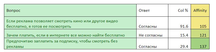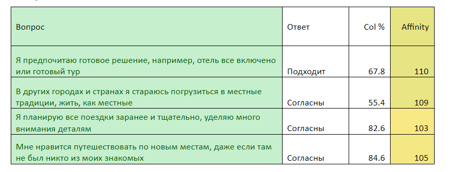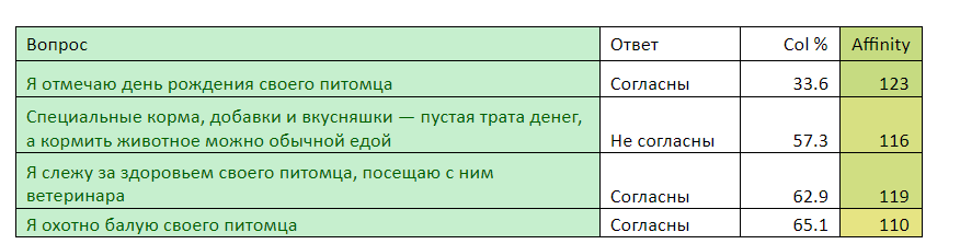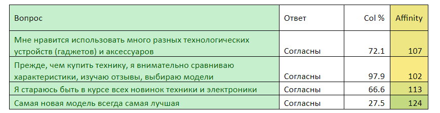 - Col % — процент покупателей техники клиента, которые дали ответ, указанный во втором столбце;