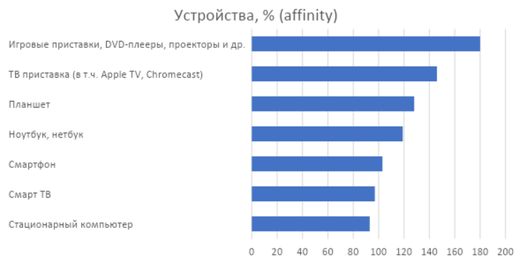 Интересные результаты показал анализ по устройствам. Оказалось, что аудитория клиента чаще пользуется не смартфонами и ноутбуками, а игровыми и TV-приставками. В меньшей степени им интересны стационарные компьютеры. Скорее всего, большая часть аудитории не привязана к рабочему месту в офисе.