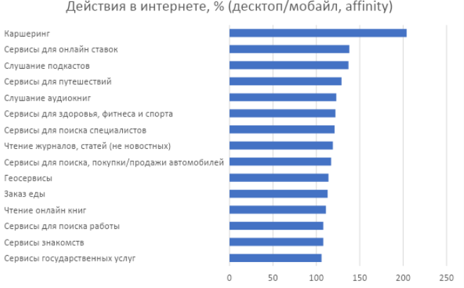 Еще аудитория часто пользуется сервисами с подкастами, для путешествий, аудиокниги. Эту информацию мы тоже будем учитывать при построении маркетинговой стратегии и подборе площадок для запуска рекламы.