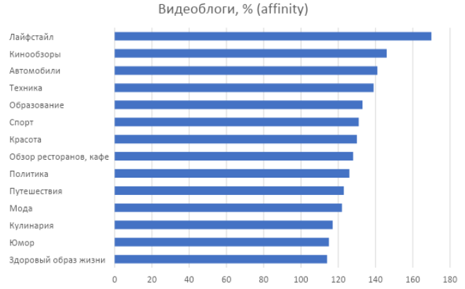 Переходим к видеоблогам. Если мы будем запускать рекламу у блогеров или на тематических площадках, эта информация очень кстати. Мы выяснили, что большинство покупателей смотрит видео о стиле жизни разных героев. Еще им нравится смотреть кинообзоры, видео про автомобили и технику.