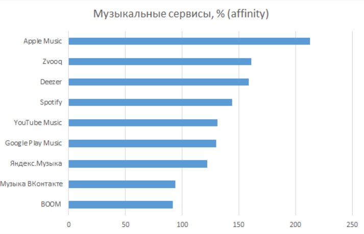 - помимо Apple Music аудитория слушает музыку через сервисы Zvooq и Deezer;
