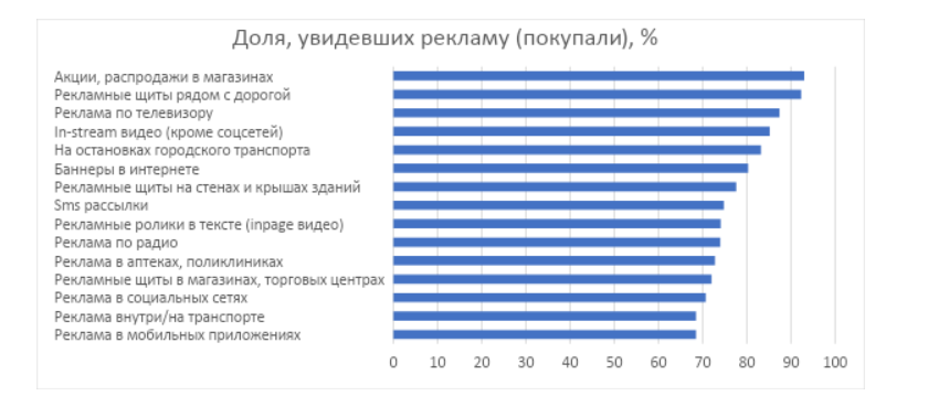 А теперь посмотрим результаты общей аудитории, среди которой проводился опрос, — тех, кто в целом покупал бытовую технику. Видим, что респонденты реже замечали рекламу в социальных сетях и мобильных приложениях. В лидерах наружная и печатная реклама в офлайне.