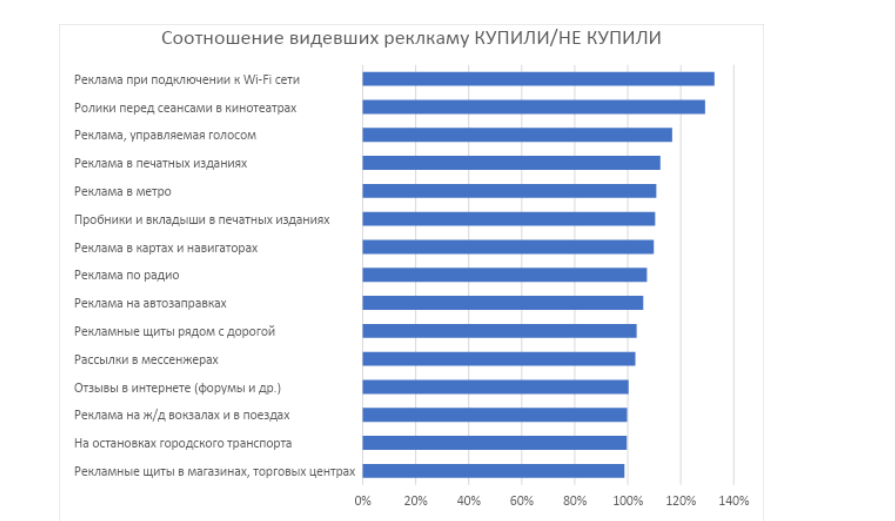 А теперь о рекламе бренда. Чаще всего покупатели клиента замечали ее в метро, при подключении к сети Wi-Fi и в роликах перед началом киносеанса. Такие результаты нас не удивили. В этих местах реклама транслируется во время пристального внимания к экрану в ожидании подключения к интернету или начала фильма.