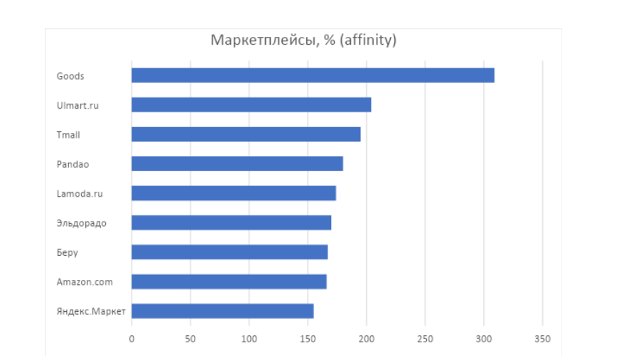 Неожиданность в результатах продолжается. Среди маркетплейсов аудитория клиента на первое место ставит сервис Goods. Ниже Ulmart.ru и Tmall. Остается только гадать, почему именно этим сервисам пользователи доверяют больше.