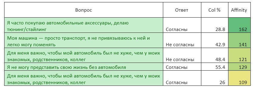 У многих пользователей из целевой аудитории есть автомобиль, и они часто покупают аксессуары, делают тюнинг или стайлинг. Машина является важной составляющей для покупателей техники клиента, без нее они не представляют жизни. Хотя многим неважно, лучше их автомобиль или хуже, чем у знакомых и родственников.