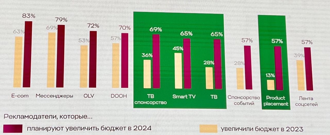 Большинство рассматривают вложения в мессенджеры (80%), OLV (72%) и DOOH (70%). Чуть более половины собираются использовать спонсорство событий, product placement и ленту соцсетей.