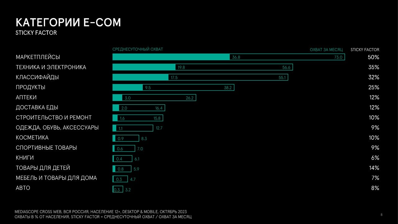 Электронная коммерция (e-com) привлекает к себе большое внимание пользователей. В общем объеме интернет-активности россиян на сервисы электронной коммерции приходится примерно 4%. E-com будет и дальше развивать коммуникации с аудиторией, используя для этого собственные мобильные приложения и сайты.