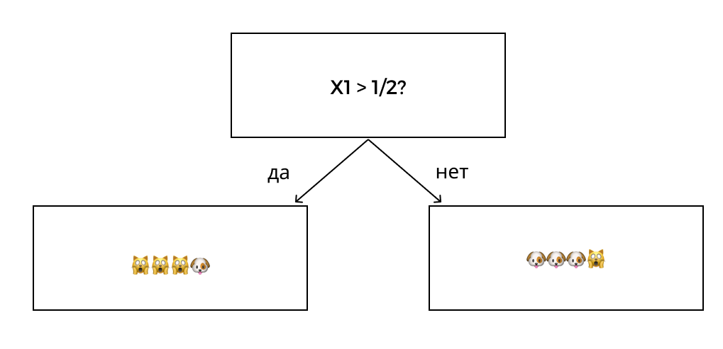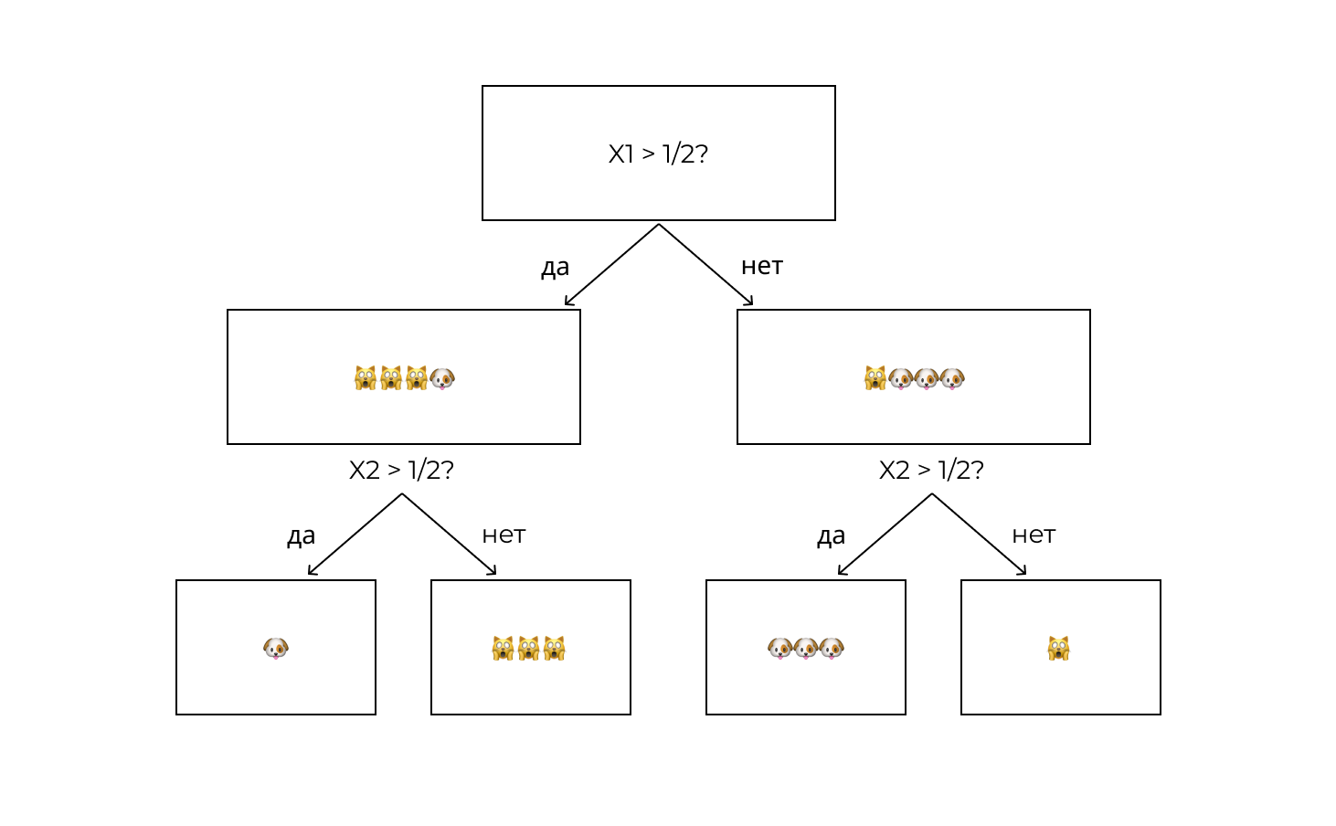 Когда мы разбили данные по признаку X1, уровень неопределенности стал ниже, но некоторая неопределенность все еще присутствует.