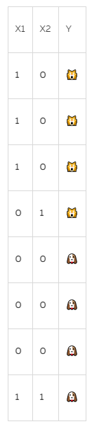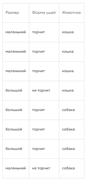 Размер и форма являются признаками наших данных, а животное — значением. В таблице видна зависимость между размером и типом животного. Задача алгоритма — найти эту связь и на основе обученной модели предсказать новое животное.
