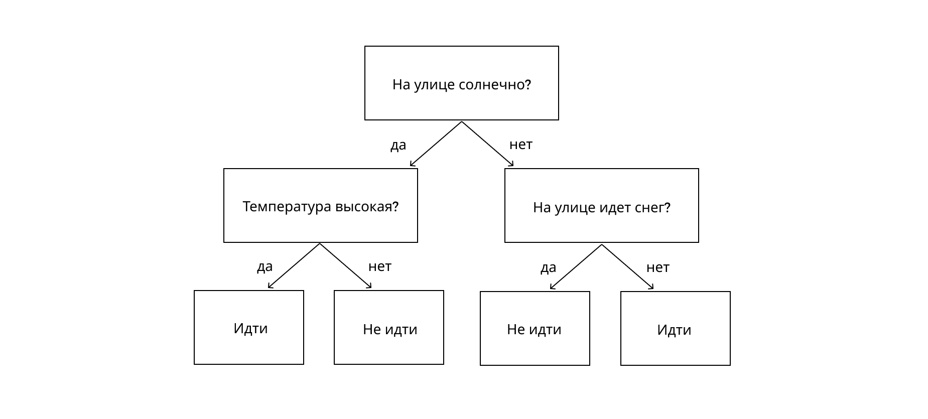 Мы неосознанно используем деревья решений, когда принимаем какое-либо решение. Например, так выглядит дерево, когда мы смотрим в окно и думаем, идти ли на улицу или лучше остаться дома: