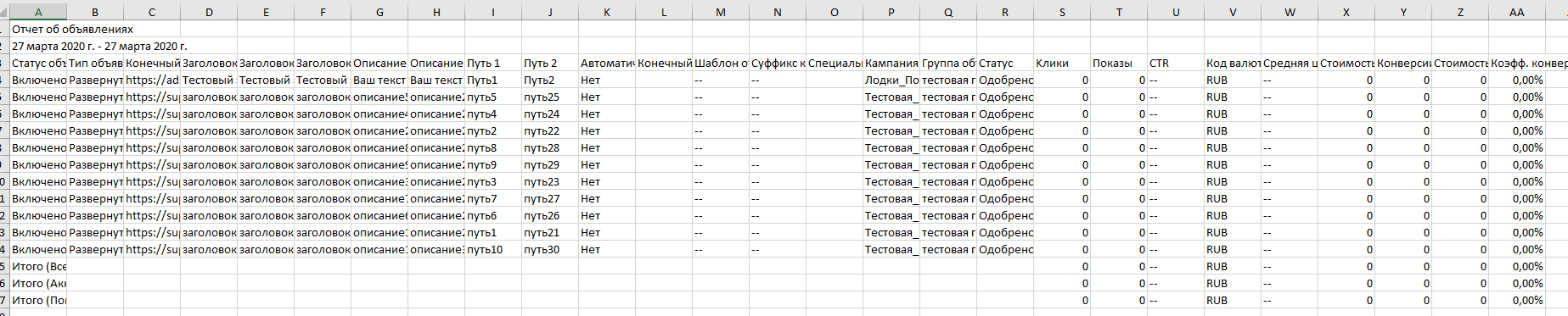 В нее можно добавить новые строки и загрузить обратно. Чтобы добавить ключевое слово, объявление или любой другой объект, создайте строку в скачанной таблице.