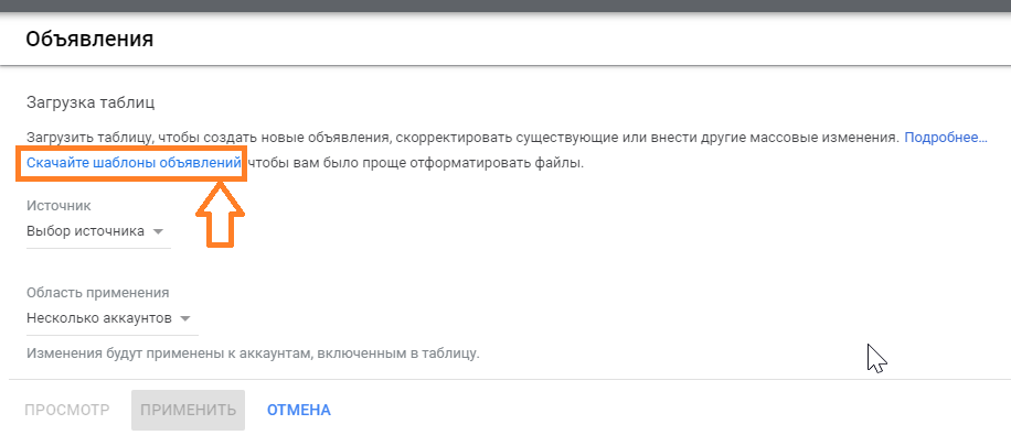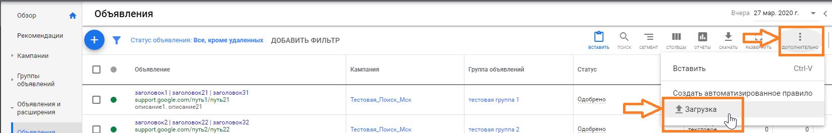 Массовая загрузка позволяет добавлять новые элементы в рекламный кабинет. С ее помощью также можно эффективно изменять ключевые слова, объявления, группы объявлений, кампании и группы товаров (для торговых кампаний) в аккаунте Google Ads.