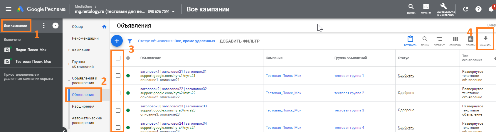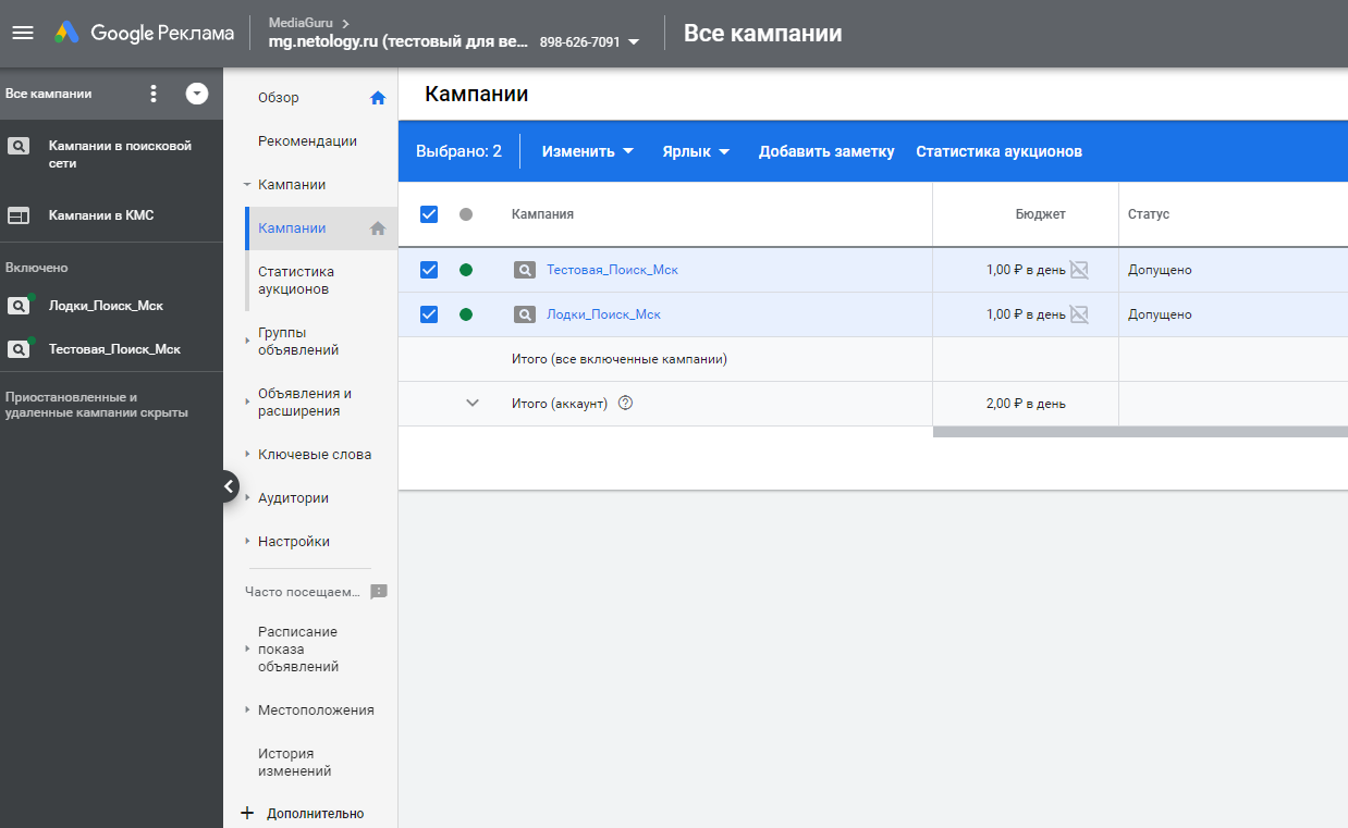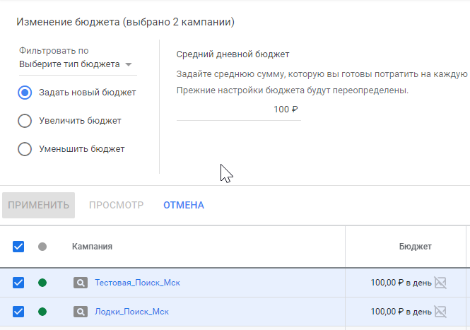2. Отмечаем флажками элементы, в которые планируем внести правки. В нашем случае это кампании: «Тестовая_Поиск_Мск» и «Лодки_Поиск_Мск».