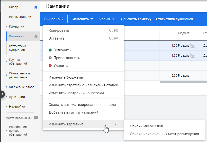 Изменить бюджеты: позволяет массово отредактировать бюджеты, доступна только на уровне РК. Как изменить бюджеты: