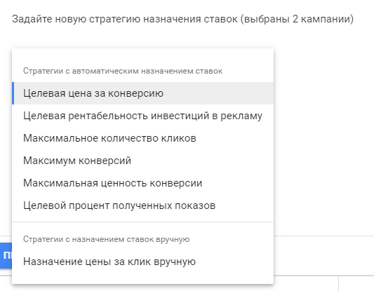 Изменить стратегию назначения ставок, изменить настройки конверсии. Функции, которые меняют стратегию и позволяют выбрать импортированные конверсии, которые мы будем использовать в РК.