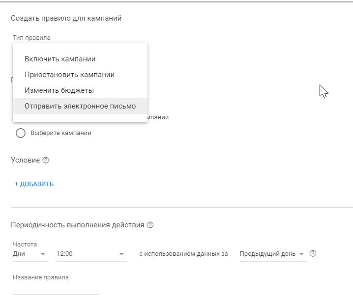Добавить в группу кампаний: позволяет объединять РК в отдельные группы. Не путать с группами объявлений!