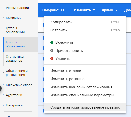 - На уровне групп можно изменить ставки, ротацию, шаблоны отслеживание и др.