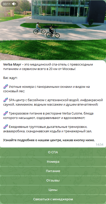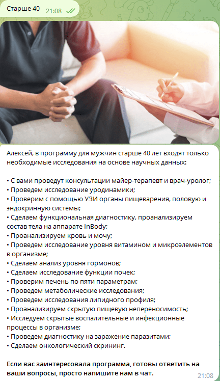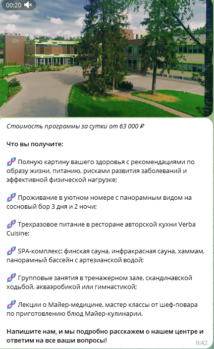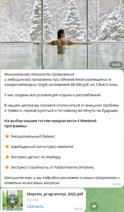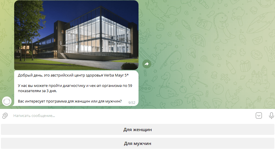Есть как трехдневные программы, так и длительные, с проживанием от 8 дней. Первостепенная задача – кратко рассказать в чат-боте о преимуществах spa-центра. Для теста взяли одно направление по комплексной диагностике и рассказали про чек-ап организма.