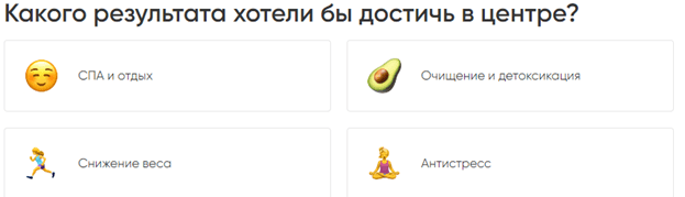 Вопросы в квизе были простыми, чтобы легче было собрать контактные данные. Сначала узнавали, какого результата хочет достичь посетитель, какая программа центра ему ближе:
