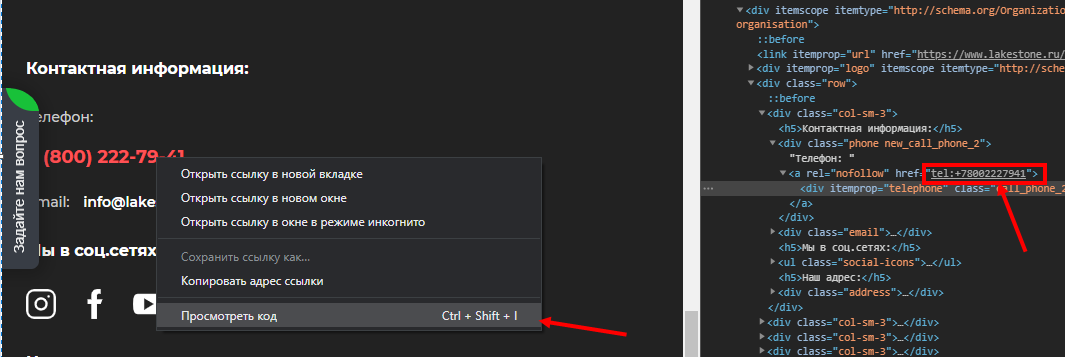 - Найдите в коде ссылку с номером телефона.