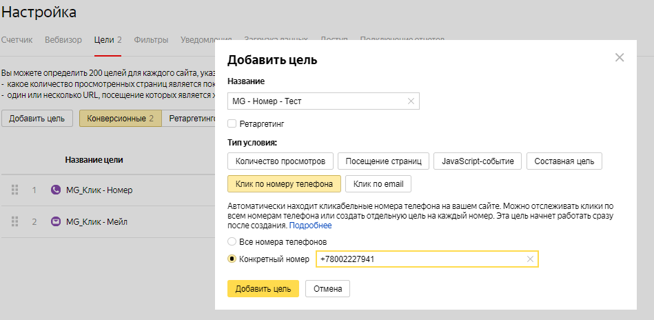 Данные в новую цель будут поступать лишь в том случае, если номер и email на сайте размечены как ссылки a href = ‘…’, а не как текст. Также ссылки должны содержать mailto и tel, соответственно. В остальных случаях данные в Метрику поступать не будут. Заранее попросите клиента позаботиться об этом.