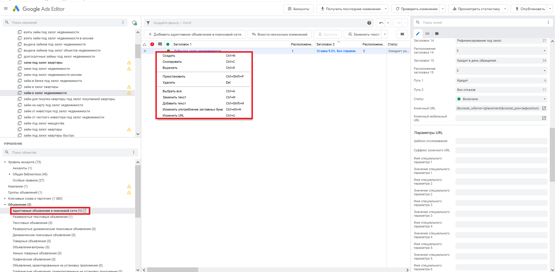 Однако я уже столкнулась с проблемой его создания. Адаптивное поисковое объявление нельзя копировать, потому что не предусмотрена кнопка «Вставить». И горячие клавиши Ctrl + V не помогут.