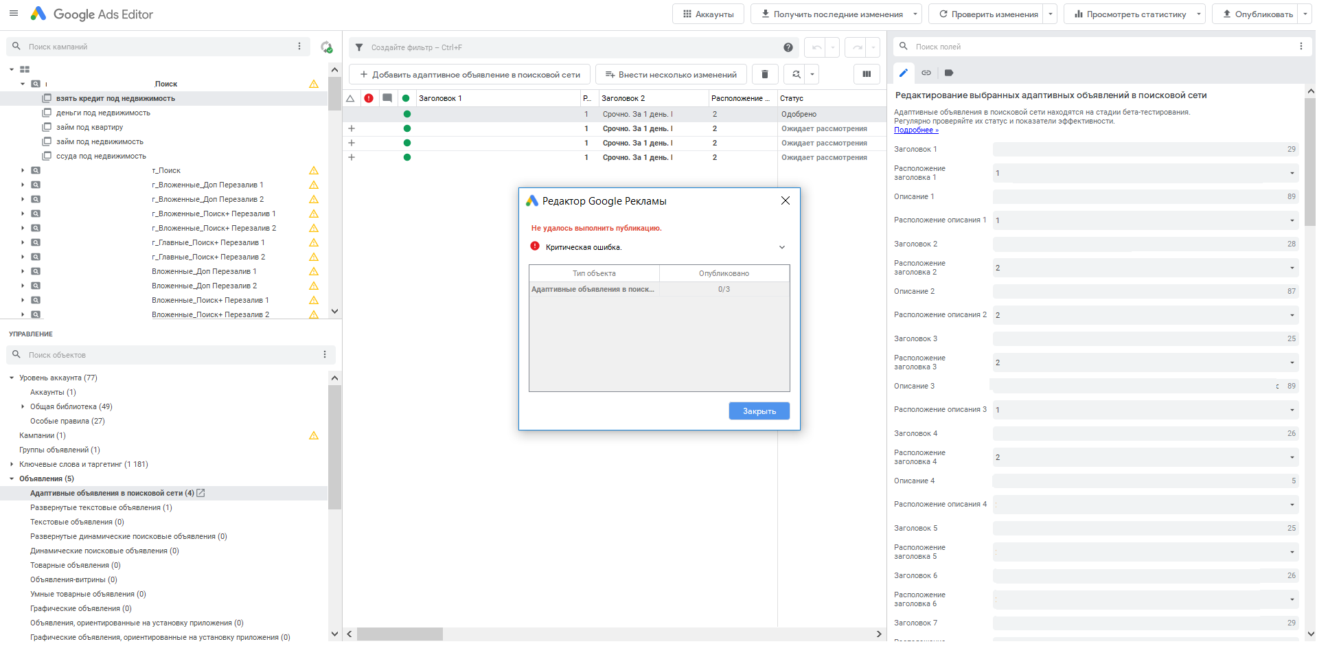Еще нельзя создать больше трех адаптивных поисковых объявлений на группу. И если у вас 3+ объявлений, отправить их не получится, а во всплывающем окне выпрыгнет «Критическая ошибка». Кстати, в справке о ней пока ничего не написано.