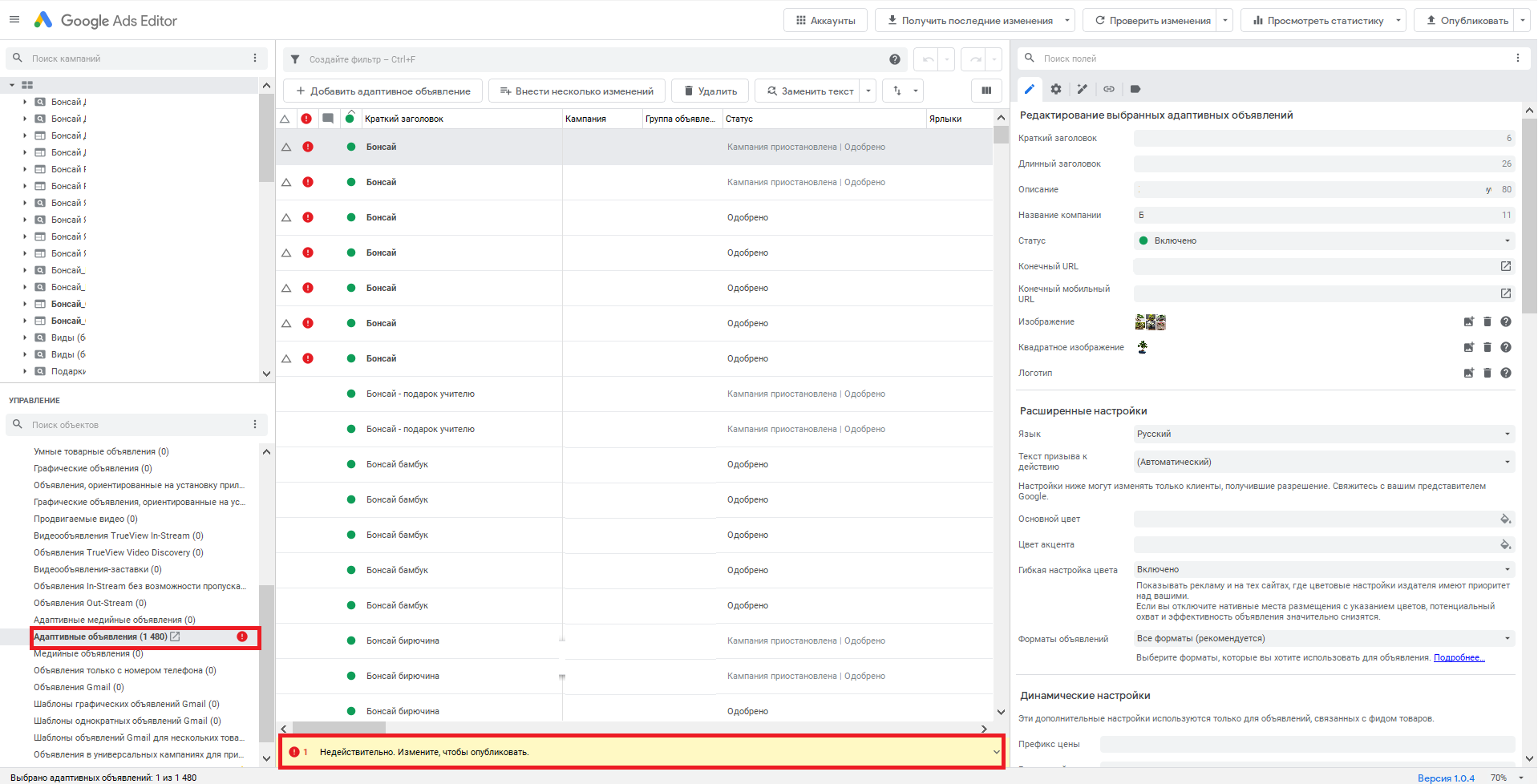 Обходной путь: нажимаем на кнопку «Внести несколько изменений» или «Добавить адаптивное объявление поисковой сети».