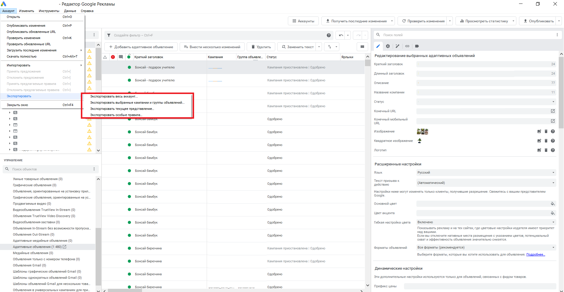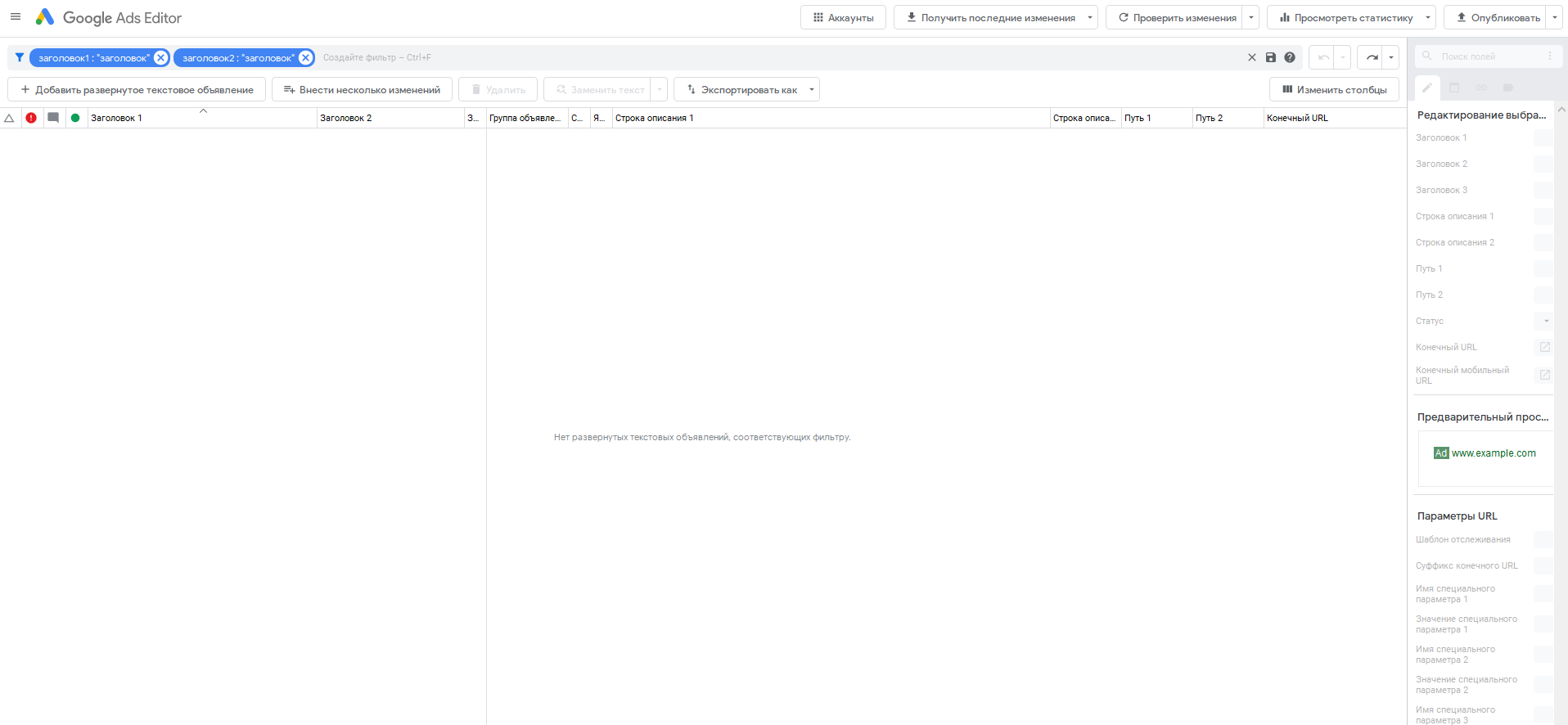 Интерфейс Редактора Google Ads