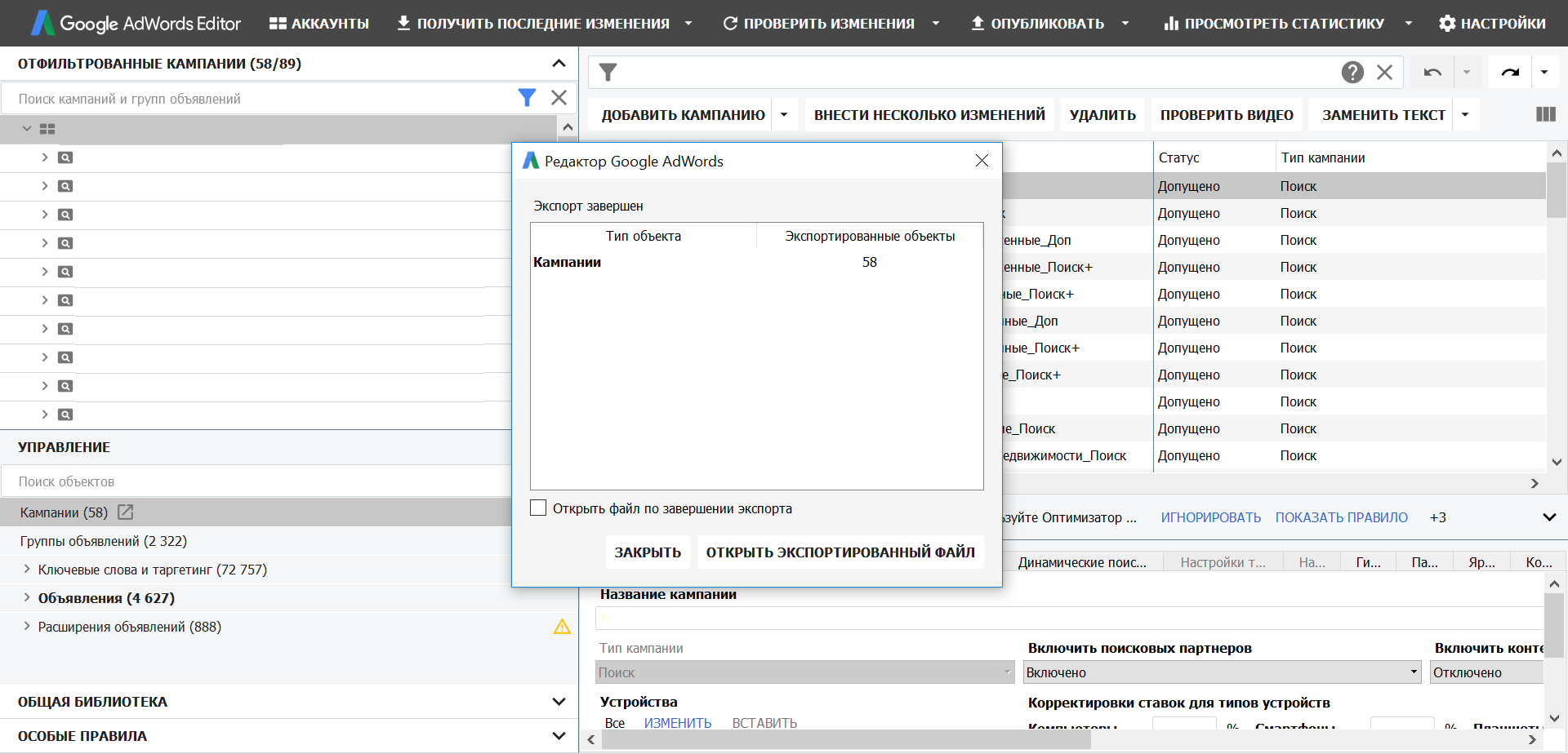 Поиск кампаний или групп