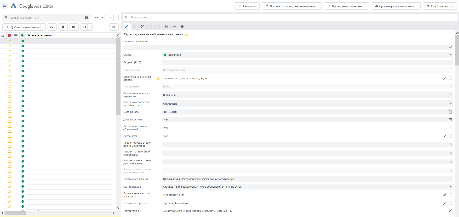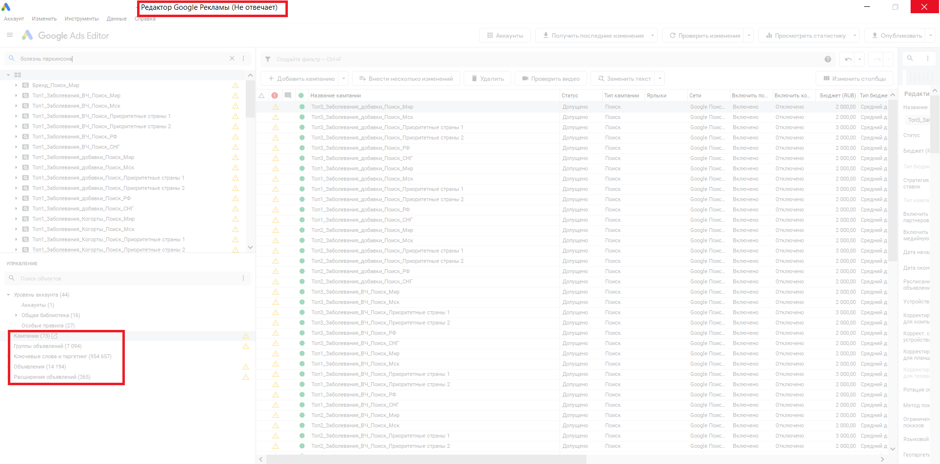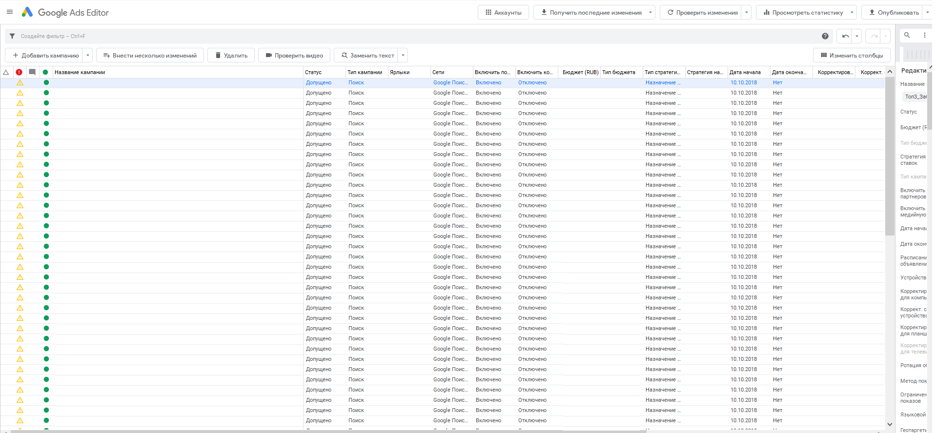 В Редакторе Google Ads удобно работать с фильтрами. Но если выделить большой массив данных (кампаний, групп, объявлений или фраз), приложение может зависнуть и закрыться. Соответственно, все выбранные фильтры сбрасываются.