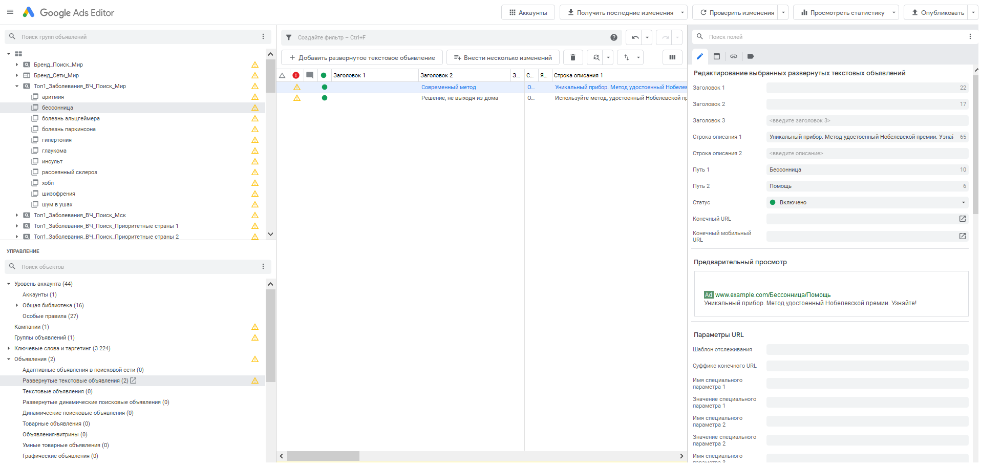 Например, мы хотим отредактировать текст в развернутых объявлениях разных кампаний для поисковой сети. Для этого выбираем все объявления, вносим правки в Заголовок 1, затем — в Заголовок 2, но видим, что корректировки применяются только к одному объявлению, а не ко всем выделенным.