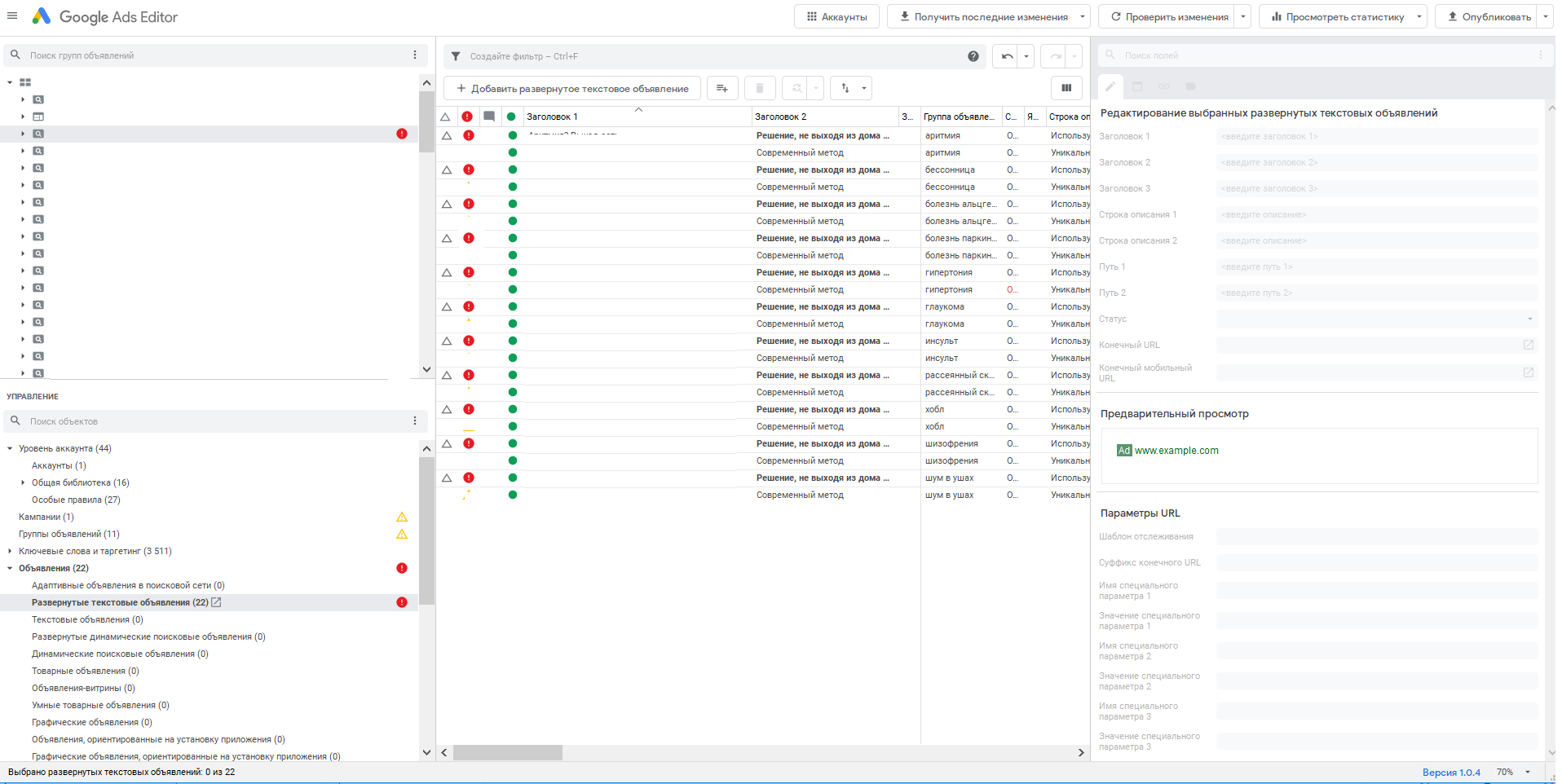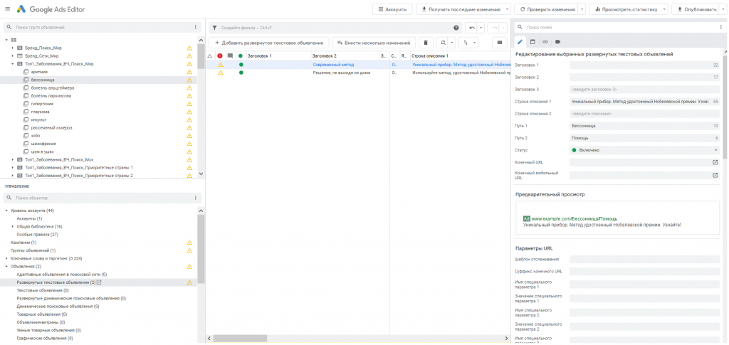 Иногда неудобно просматривать информацию в окне просмотра данных. Скажем, нам нужно одновременно открыть дерево аккаунта и панель редактирования, чтобы посмотреть, какие объявления в какой группе находятся. Приходится что-то скрывать: заголовки 2-3, строку описания 2 или саму панель.