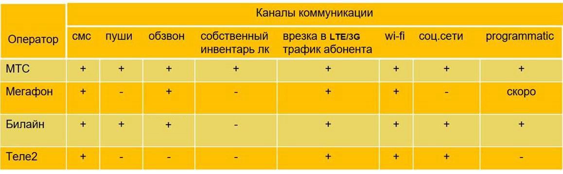 Каждый оператор предлагает свои методы работы с сегментами. Инвентарь большой: от рассылки СМС до запуска медийной рекламы. Предлагаем изучить таблицу, в которой отражены способы использования офлайн данных.